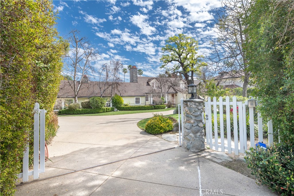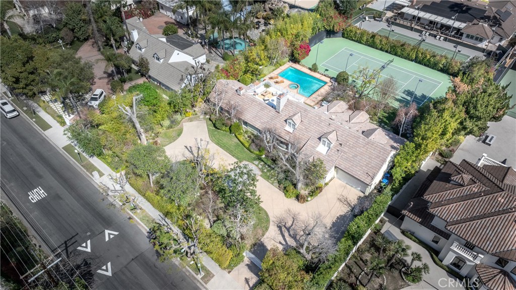 Nestled behind private gates, this stunning tennis court estate sits gracefully on a beautifully landscaped 29,125 sqft flat lot with great frontage set back from the street with a circular driveway and towering, majestic trees. A charming brick-lined front porch welcomes you into the home, where a formal entry leads to a bright and airy living room adorned with walls of glass, a fireplace, custom-built-ins, gleaming wood floors, and elegant oversized crown moldings. The formal dining room is perfect for entertaining, featuring chair moldings and walls of glass that invite natural light. A chef's dream, the kitchen boasts skylights, a breakfast bar, glass-fronted cabinetry, granite counters and backsplash, and top-of-the-line appliances. A cozy breakfast area with a built-in hutch, ceiling fan, and direct backyard access makes indoor-outdoor living effortless. The expansive family room impresses with walls of glass, vaulted ceilings, a striking stone fireplace, a wet bar with a wine fridge, and French doors opening to the backyard oasis. A separate office with sliding glass doors and vaulted ceilings provides a private workspace. The front bedroom offers beamed, vaulted ceilings, a pro-organized walk-in closet, and serene views of lush greenery. An additional bedroom features high ceilings, built-in dressers, desks, and custom-organized closets, sharing a luxurious bathroom with dual sinks, a soaking tub, and a walk-in rain shower. Another bedroom includes oversized crown moldings, while an additional bathroom offers linen storage and direct outdoor access for convenience. Upstairs, the primary retreat boasts a fireplace, built-ins, skylights, a private balcony, and a spa-like ensuite with a soaking tub, walk-in shower, dual sinks, and a massive custom walk-in closet. The star of the show is the backyard which is an entertainer's paradise, featuring a brick-ribboned pool and spa, a grassy yard, multiple conversation areas, a built-in BBQ, and a full-size, north/south tennis court with lighting. Additional amenities include a 4-car direct-access garage, a spacious laundry room with a sink and storage, recessed lighting, and a security surveillance system. This exceptional estate seamlessly blends elegance, comfort, and resort-style living in a prime location, truly a must-see and a rare offering!